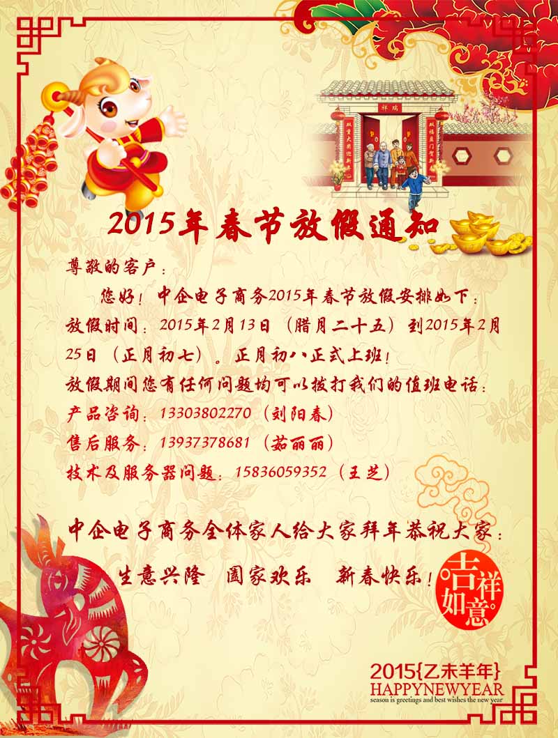 中企電子商務(wù)2015年春節(jié)放假通知 更新時(shí)間:2015-02-10點(diǎn)擊次數(shù):5657次
